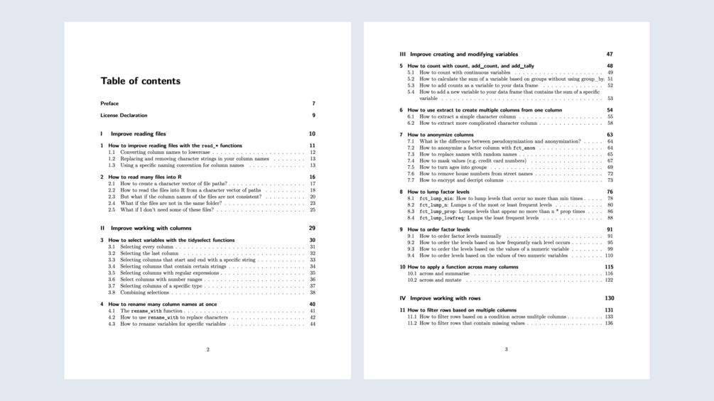 Transform yourself from a beginner to an advanced Tidyverse user with the help of this PDF-book. The book contains a collection of the most fascinating and useful Tidyverse tricks. I have been gathering all Tidyverse tricks I could find since June 2022 and compiled them into this singular resource. To date, over 900 individuals have downloaded the eBook.